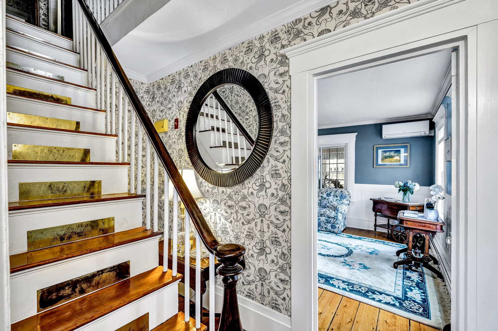 Brighten your vacation on the Cape in this simple, but elegant, room decorated in calming shades of blue. Amenities include a bathroom with shower/tub combo, ductless A/C unit, fridge, and a closet with ironing board and iron. Must be able to climb a steep set of stairs to lodge in this room.
